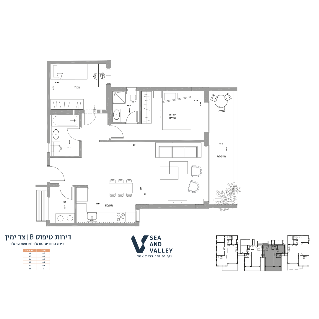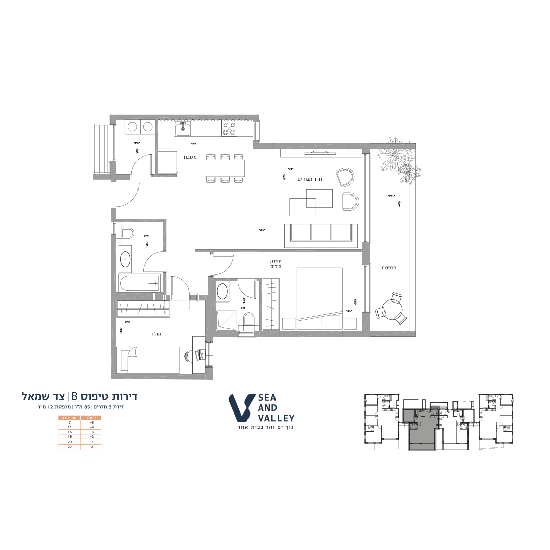 דירת 3 חד' 85 מ"ר + מרפסת 12 מ"ר (צד שמאל)